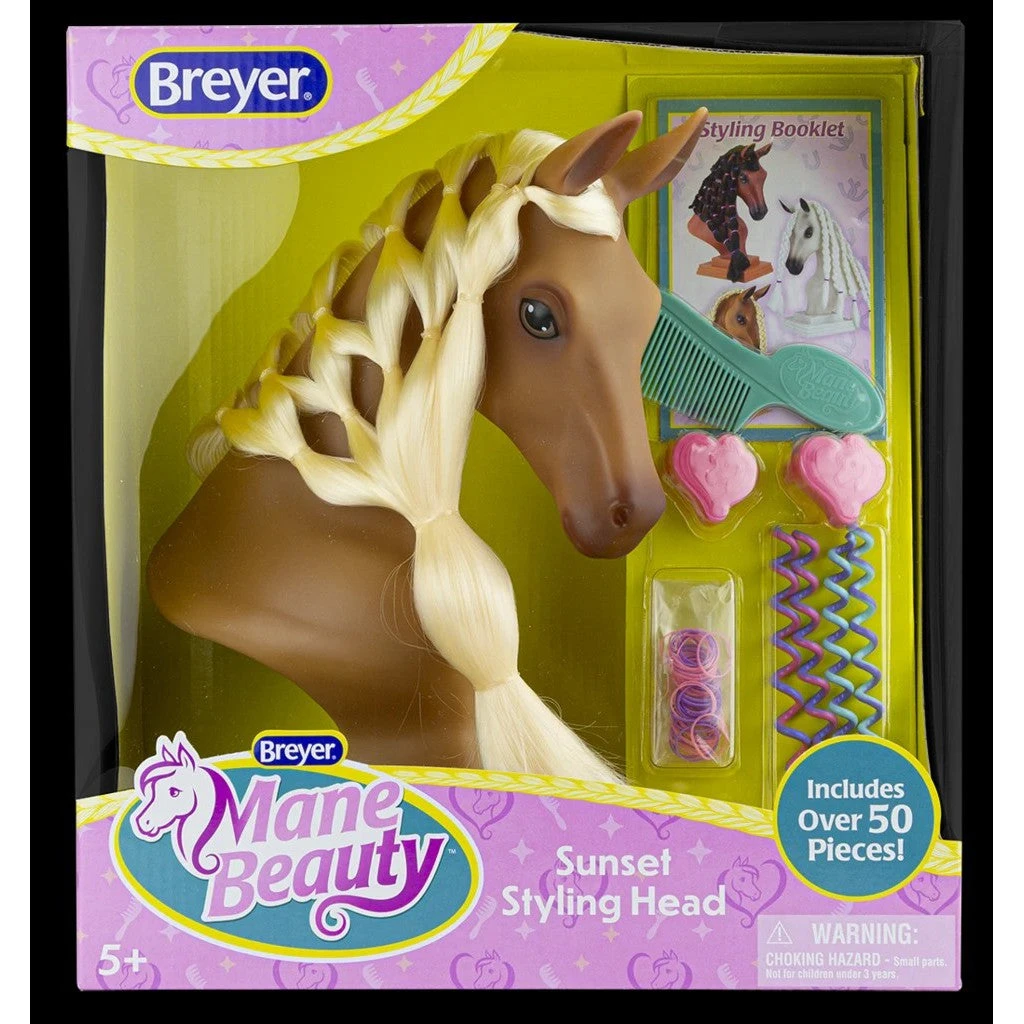 Girls love hair play and girls love horses! Sunset has a blonde mane. Breyer Mane Beauty Styling Heads combine these two interests in a new, exciting way! Through their long, silky mane; realistic sculpt; and diversely decorated colorways, Breyer Mane Beauty Styling Heads introduce a fun avenue of play for girls! Breyer showcases the inspiring beauty of horses and invites girls to create and bring to life their own vision of horse beauty with a Horse of their very own. Styling, grooming, and creating magnificent braids has never seemed so fun!
