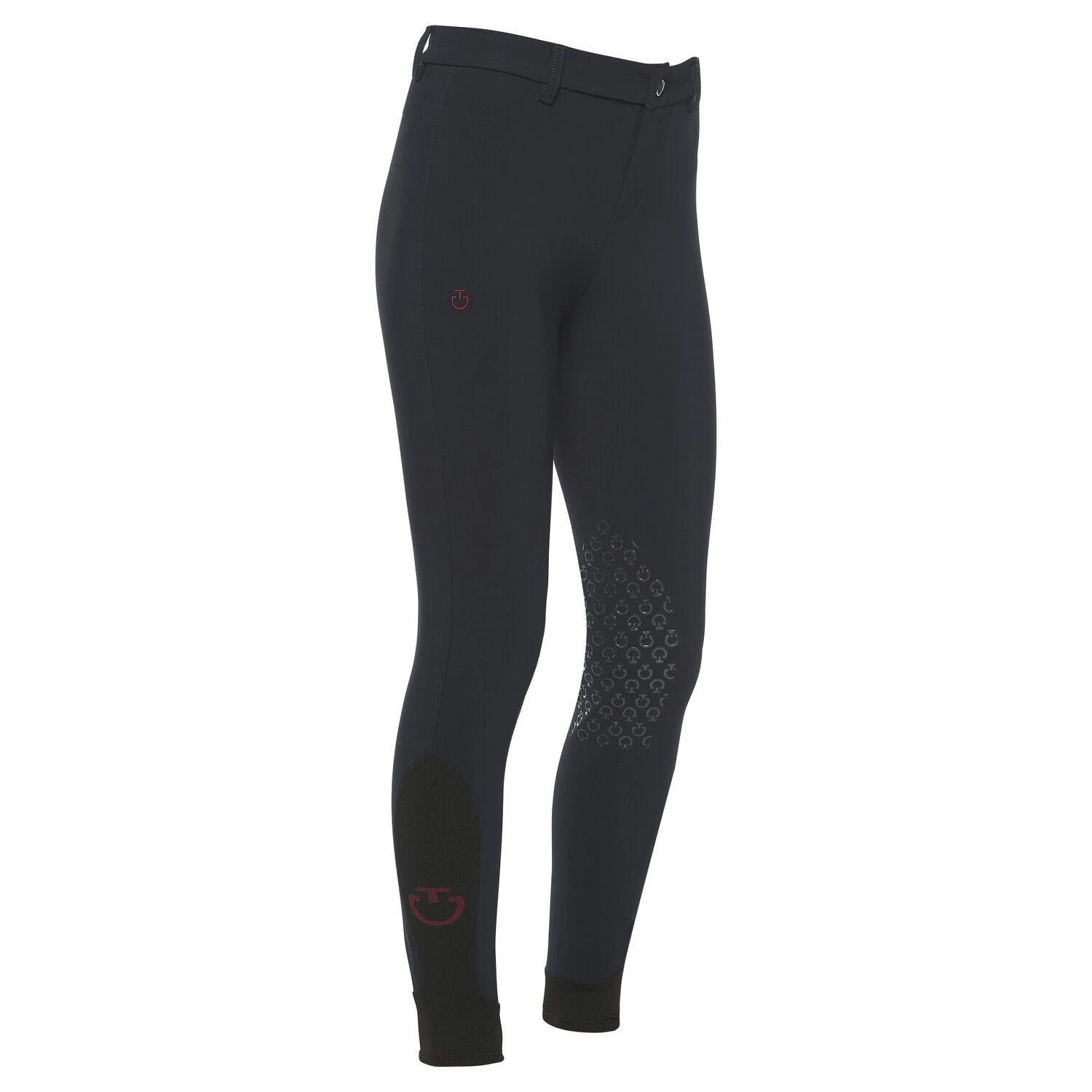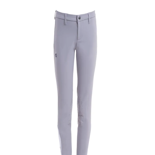 The kid’s riding breeches are made from technical 4-way stretch jersey, which provides breathability and freedom of movements: they fit to the body letting you focus on the performance. The transparent knee grip allows the right stability on the horse and the elastic knit socks fit easily beneath your boots. They feature a front zip with button.