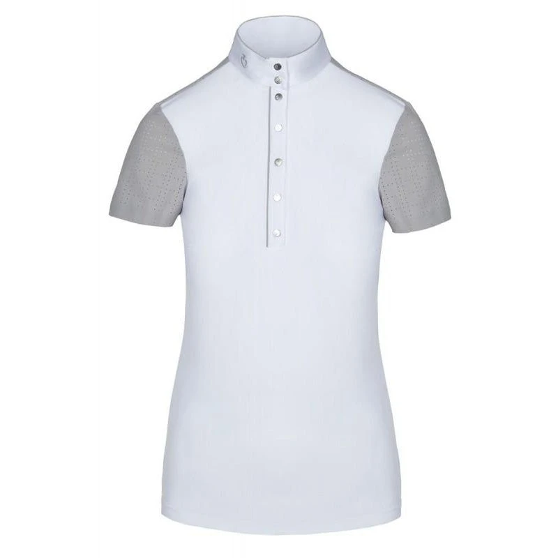 Stylish competition shirt with Cavalleria Toscana modern technology, highlighted with perforated back and sleeves, the CT emblem embroidered on the collar and attention to detail with the button studs down the front of the shirt. Â