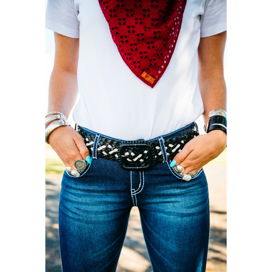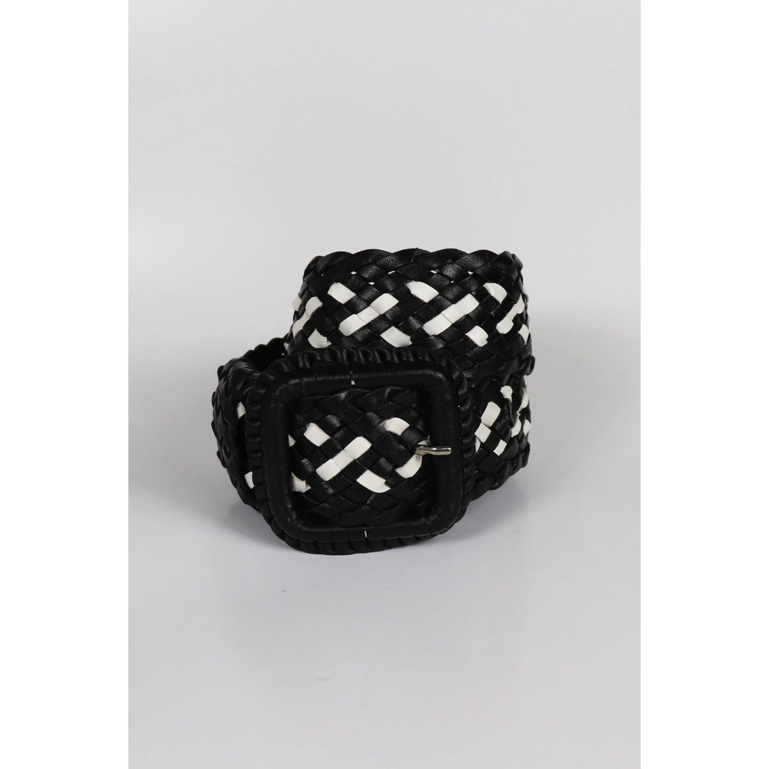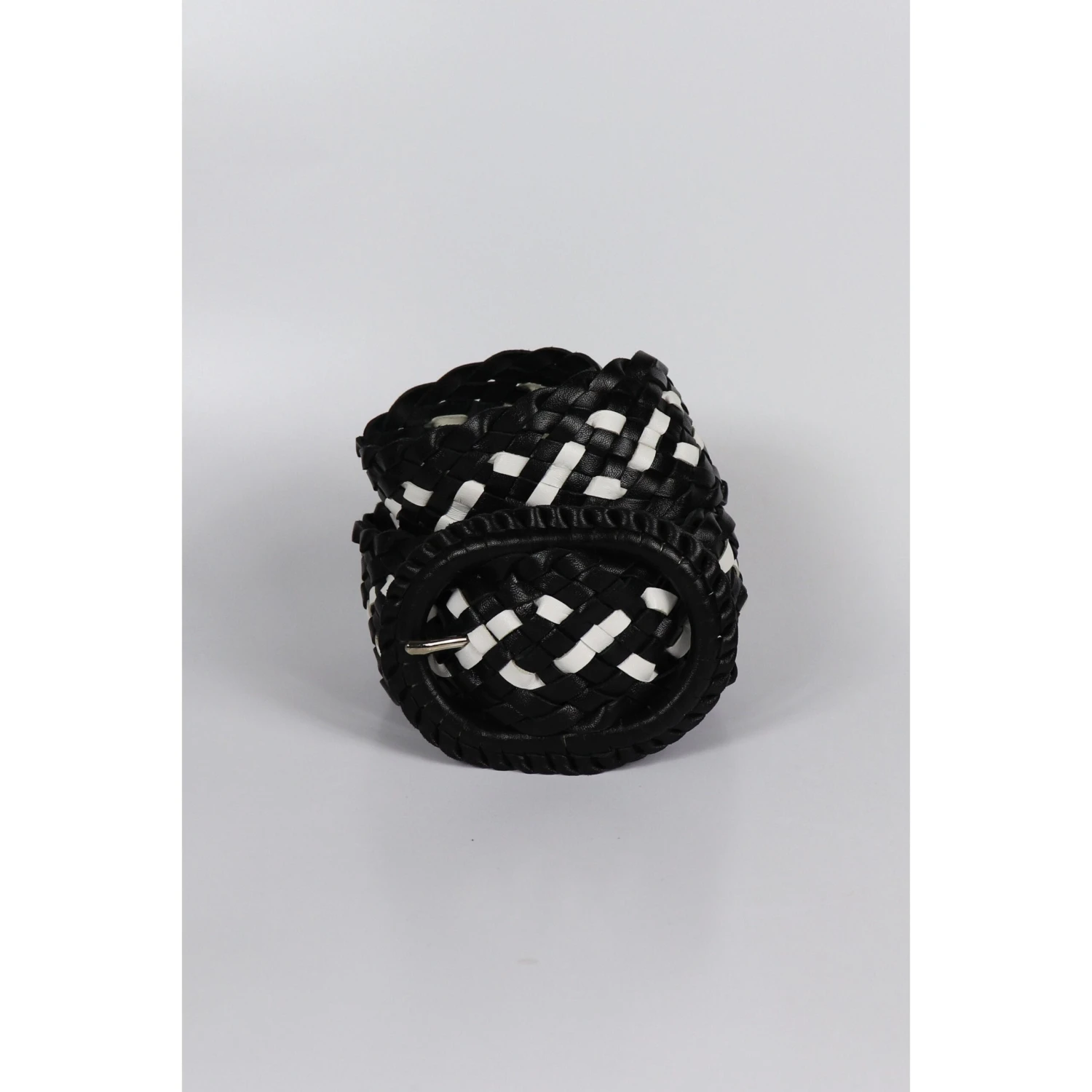 Black and white plaited leather belt with square laced or oval laced buckle option. Maximum 50mm width. (Narrower belts by order). Sizes Small (97cm), Medium (107cm), or Large (117cm) length options as standard. Please note these are total length measurements in cm. Please contact us directly for assistance with sizing or to arrange a custom length. Further charges will apply to longer belts. All belts are reinforced at the back to prevent holes pulling through.