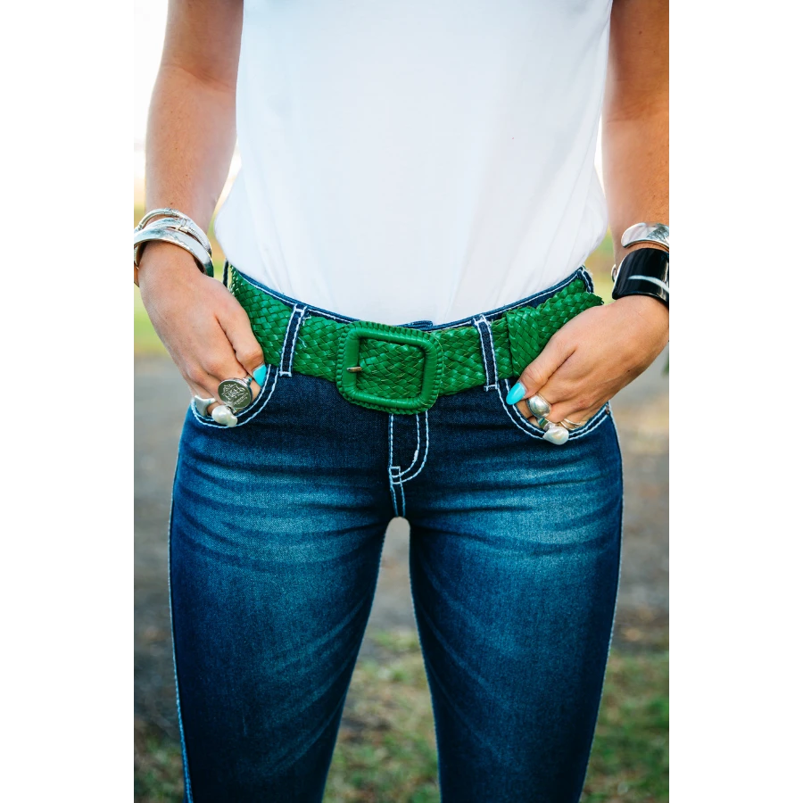 Emerald plaited leather belt with square laced or oval laced buckle option. Maximum 50mm width. (Narrower belts by order). Sizes Small (97cm), Medium (107cm), or Large (117cm) length options as standard. Please note these are total length measurements in cm. Please contact us directly for assistance with sizing or to arrange a custom length. Further charges will apply to longer belts. All belts are reinforced at the back to prevent holes pulling through.