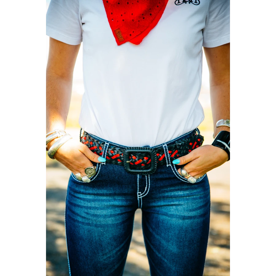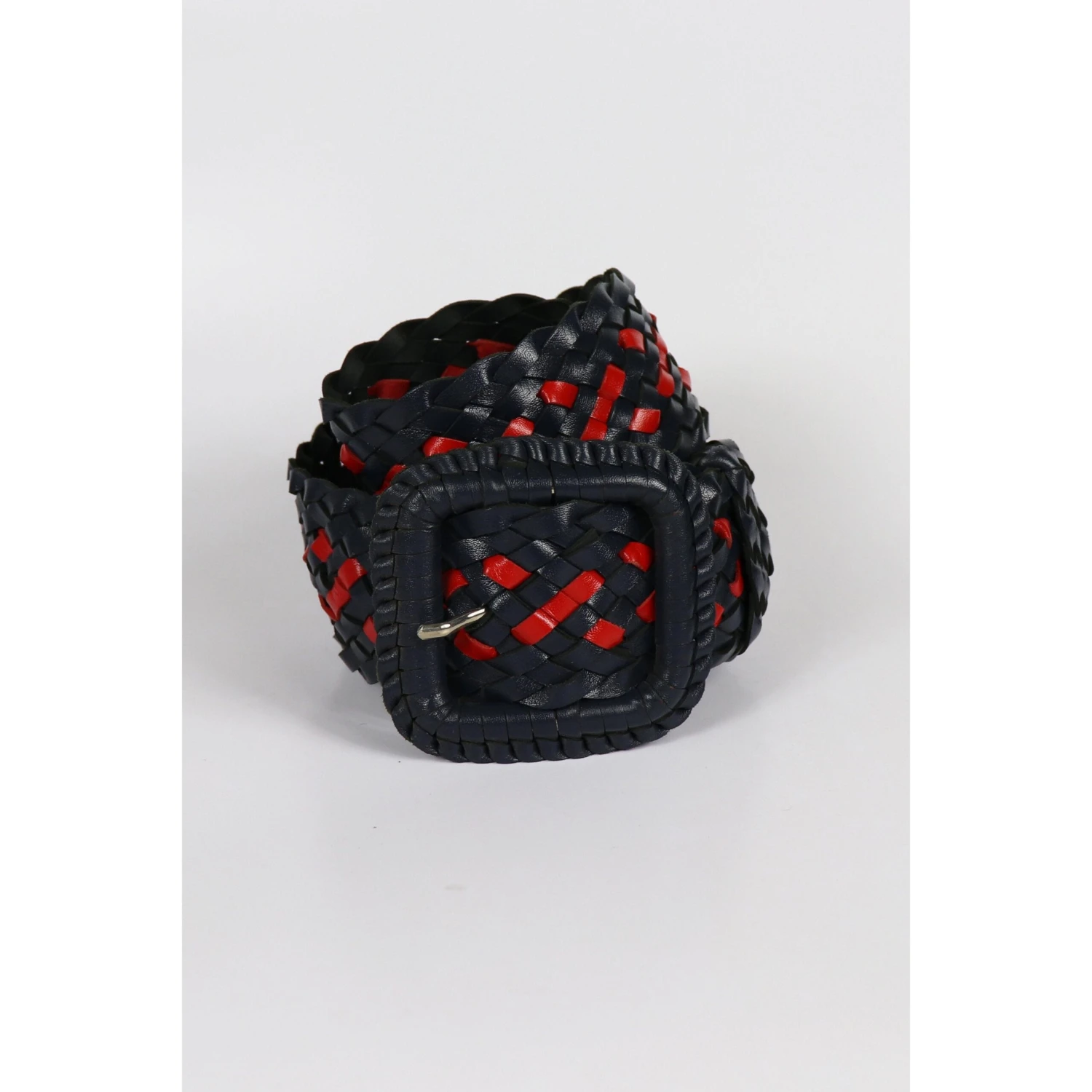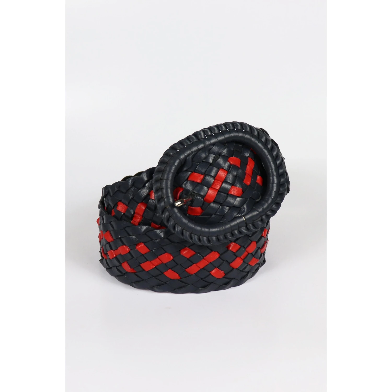 Navy & red plaited leather belt with square laced or oval laced buckle option. Maximum 50mm width. (Narrower belts by order). Sizes Small (97cm), Medium (107cm), or Large (117cm) length options as standard. Please note these are total length measurements in cm. Please contact us directly for assistance with sizing or to arrange a custom length. Further charges will apply to longer belts. All belts are reinforced at the back to prevent holes pulling through. PLEASE NOTE: THIS COLOUR COMBINATION IS DISCONTINUED.