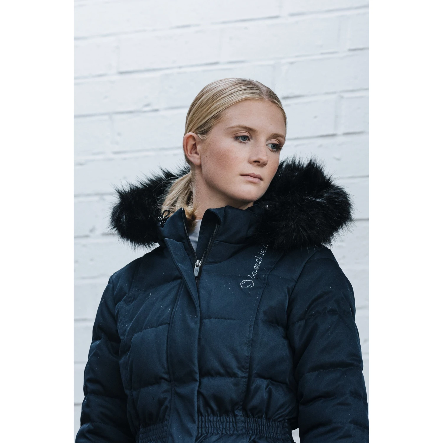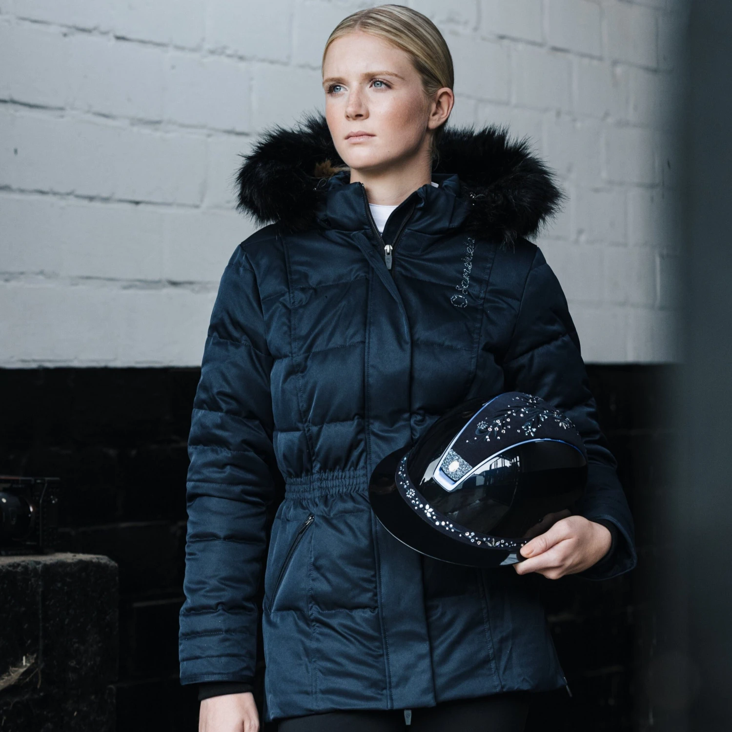 The removable hood with faux fur edge and the elastic cuffs provide additional protection from rain and wind. Being equipped with zippers on the sides, this jacket is easily worn in all kinds of situations. The breast section of jacket  Méribel has been festooned with Swarovski® crystals.