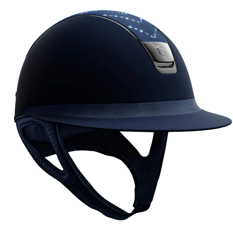 Navy with blue Swarovski® crystals black chrome trim and navy alcantara front band.