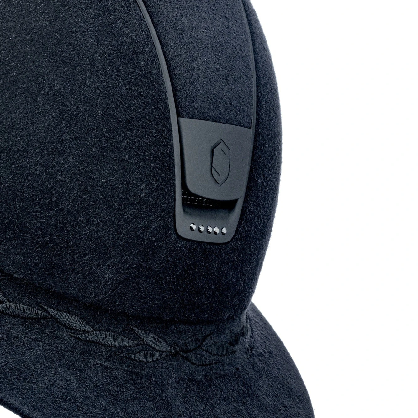 The frontal band in Alcantara® with Flower Embroidery compliments the Matt trim and is elegantly highlighted with 5 Swarovski® limited edition stones: Jet Hematite crystals for the Black version and Crystal Metallic Blue crystals for the Navy version.